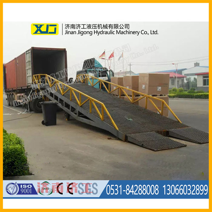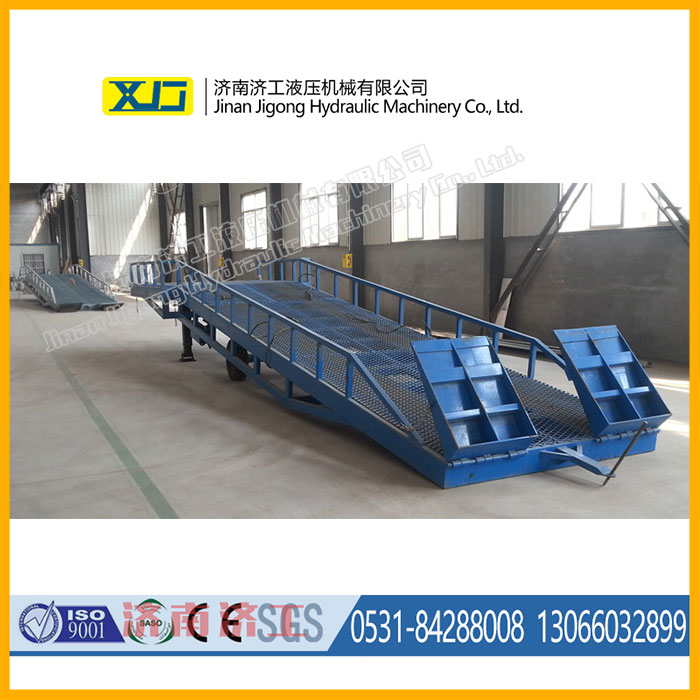 1. 用于貨物裝卸位置不固定場合的用貨物裝卸輔助設備,是實現(xiàn)貨物快速裝卸的專用物流機械,通過它使叉車等搬運車直接進入貨車、列車車廂裝卸貨物,在提高工效的同時又能充分保障作業(yè)安全。 2. 移動式登車橋的頭部設計有兩個互成90°的登車跳板,這種設計可以使用戶能夠合理地利用場地作業(yè),減少作業(yè)場地,具有很好的場地適應性。 3. 采用前腿支撐方式,穩(wěn)定性好; 4. 高度調節(jié)范圍大,適合各種工況; 5. 坡度低,配有安全鏈條和標示,安全性好; 6. 臺面均設計為網(wǎng)格狀鋼板,這種結構能證具有很好的強度,又具有防滑功能,還能方便地清掃工作臺面,使它能經(jīng)常地保持清潔、美觀。 7. 無須外接電源,通過手搖泵作動力能輕松地在其整個調整范圍內按50mm的倍數(shù)進行高度的調整??梢猿浞诌m應各種不同高度的貨車。 8. 需要移動時,可利用叉車作牽引,配用隨機配備的快夾即可方便地進行移動,從而實現(xiàn)貨物的快速裝卸。  | |